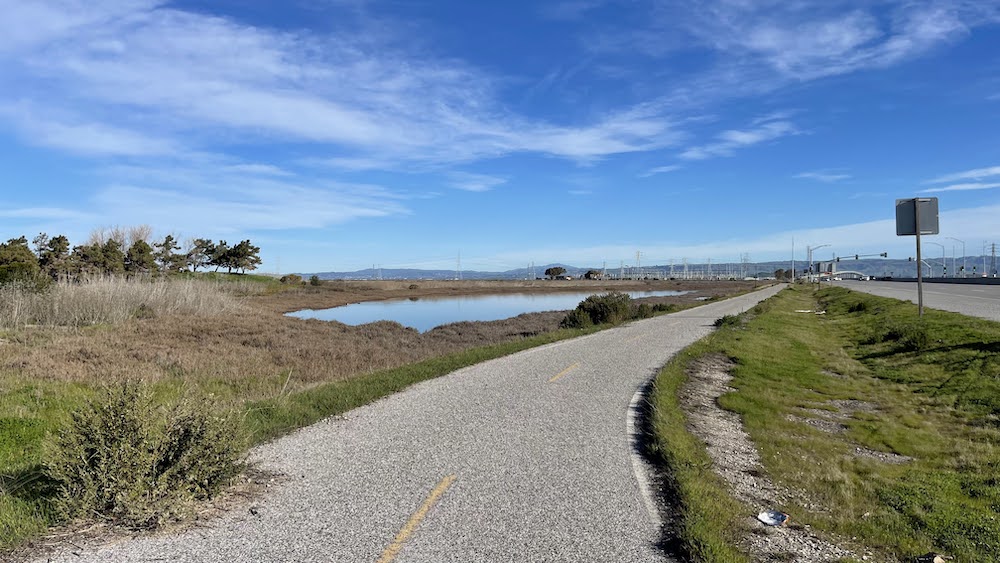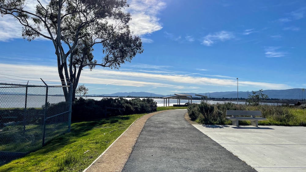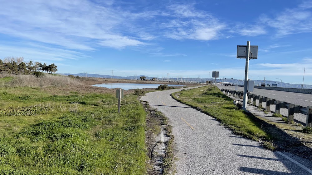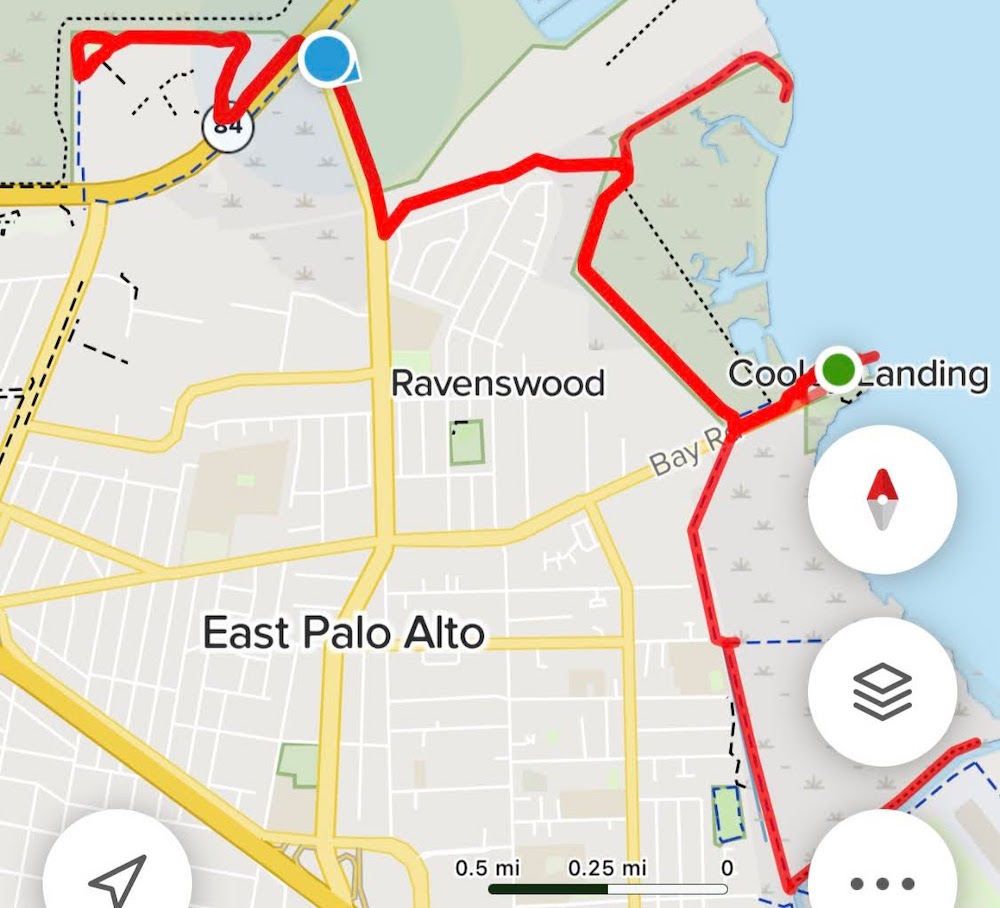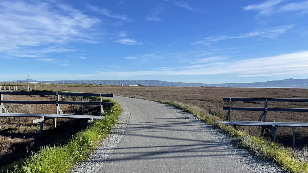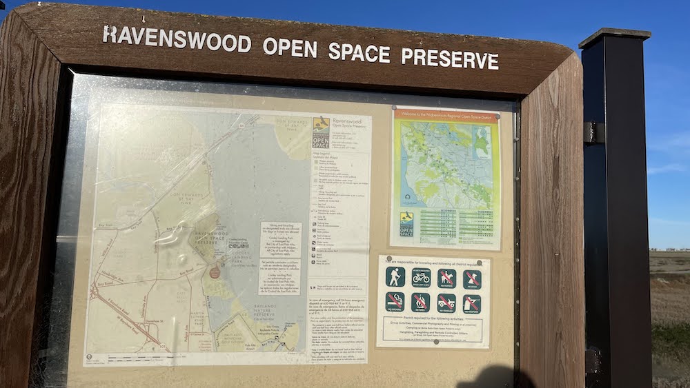 The trail is on the San Francisco Bay Trail to more than 350 miles of trails that circle the bay at East Palo Alto area. The trail come and back between the Cooley Landing and Facebook Head Quarter, approximately 6 miles. The trail is surrounded by the Don Edwards San Francisco Bay National Wildlife Refuge's Ravenswood Ponds.