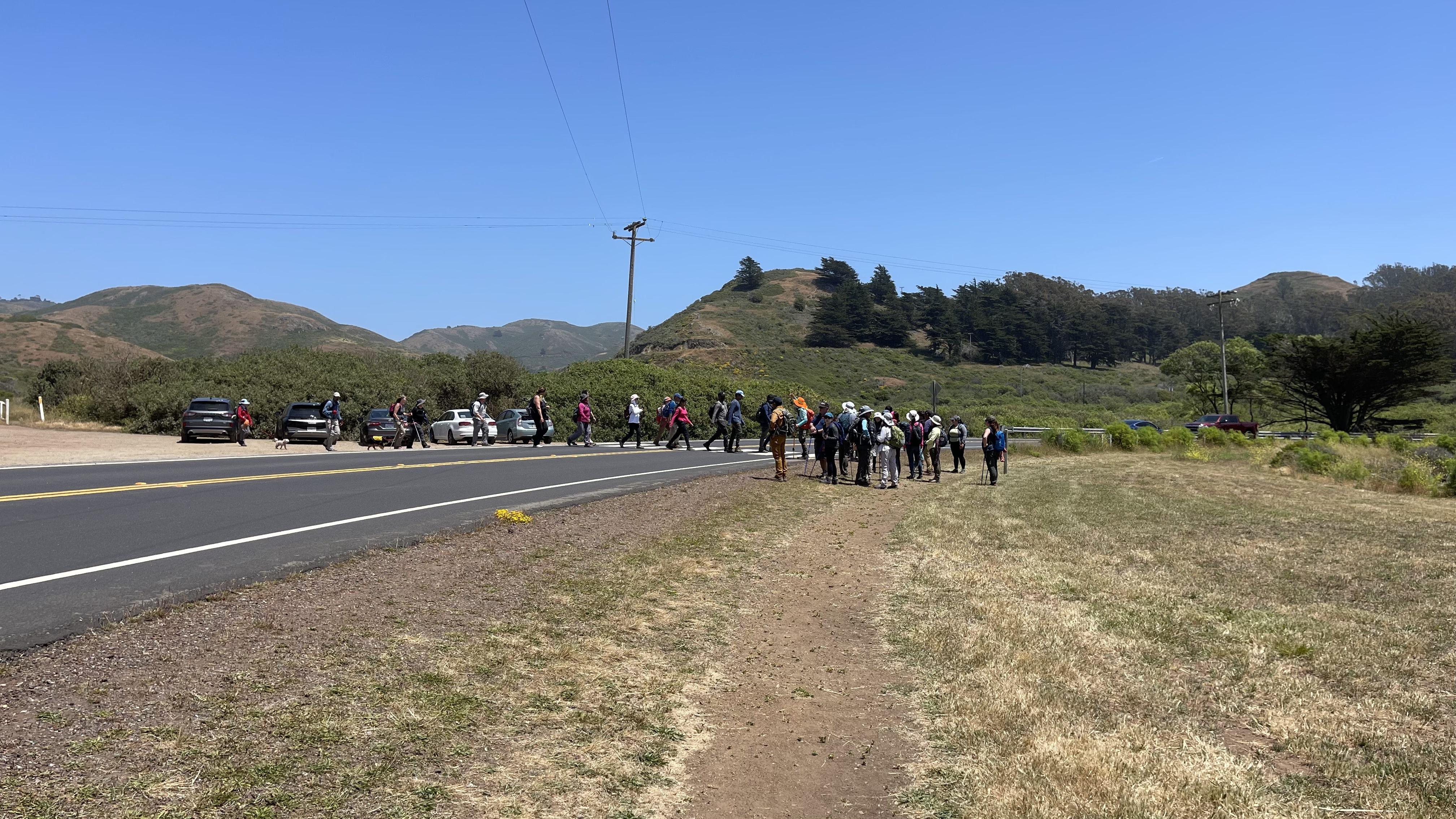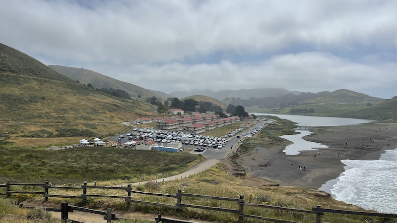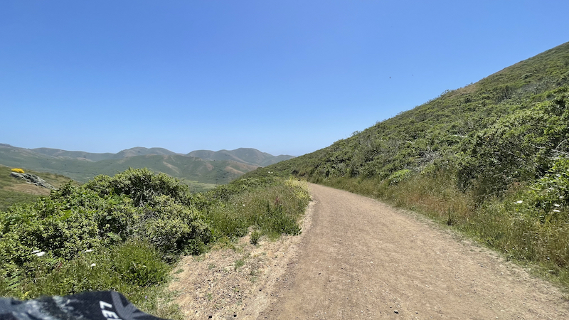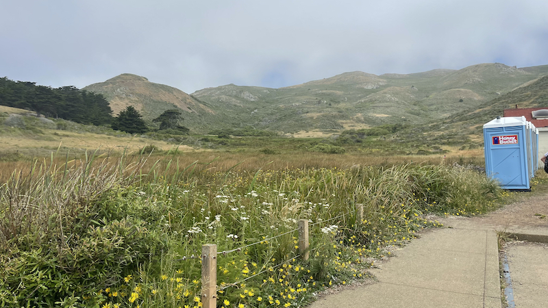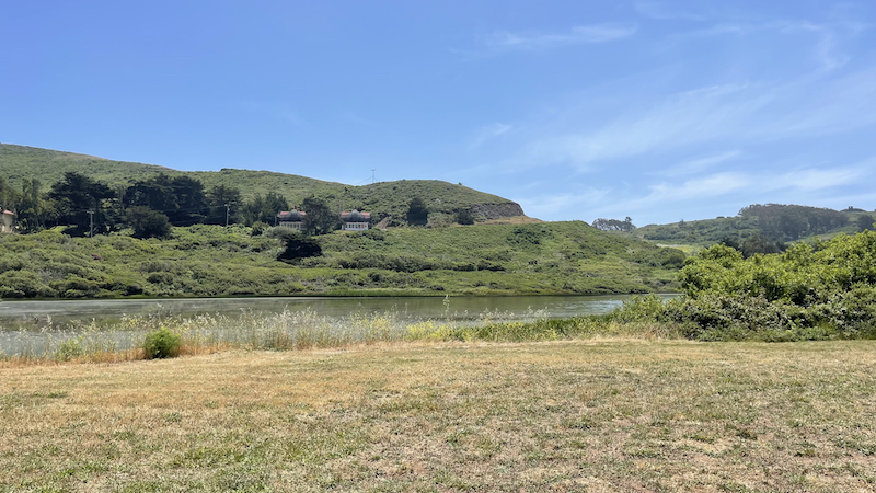 The Hill 88 Loop starts across the street from the parking lot and heads out on a path beside Mitchell Road, going past Rodeo Lagoon. This part of the route goes for 0.7 mi then use the crosswalk to access the Miwok Trail Trailhead. This happens when Mitchell Road / Bunker Road goes right.